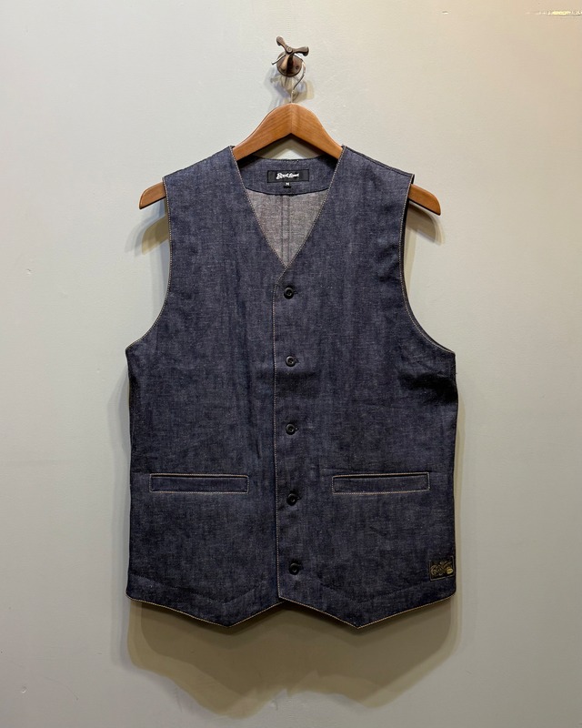 綿85%麻15%7.4オンス デニムベストです。 ※後日、共生地の長袖シャツを製作予定です。 セットで着る事ができます。 一部のステッチにアクセントとして、オレンジステッチを使う事で、Gジャンやカバーオールのインナーとして着た時にも相性が良いです。 シャツの上から着るスタイリングにも使えます。 ポケット付きなので便利です。 S 肩幅37 身幅48 前着丈67.5 後着丈62cm M 肩幅37 身幅52 前着丈69.5 後着丈64.5cm L 肩幅38 身幅53 前着丈70 後着丈65cm ノンウォッシュ状態で計測 洗濯後、1〜2cm縮みが出ます。